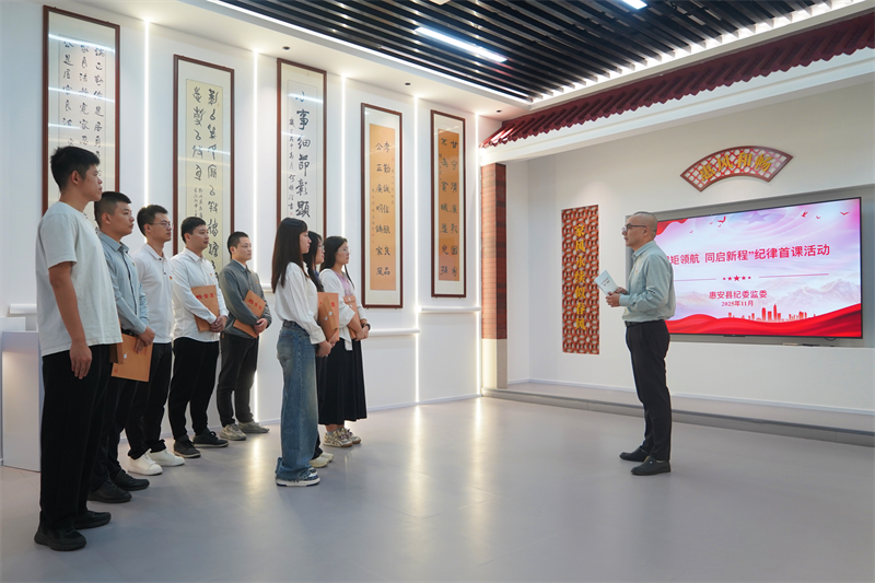 为深入贯彻落实习近平总书记关于加强纪检监察干部队伍建设的重要指示,进一步强化对新入职干部的教育管理,惠安县纪委监委坚持把纪律教育摆在突出位置,创新融合党性教育、警示教育、家风教育,近日,在惠安家风家训展示馆开展“规矩领航 同启新程”纪律首课活动,为8名纪检“新兵”上好入职第一课。