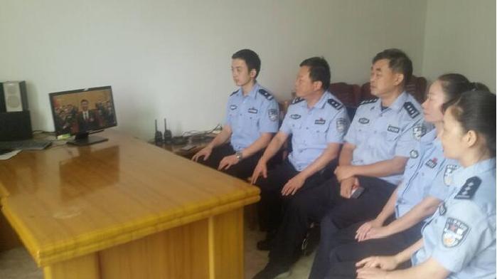 图为驻县公安局纪检组干部与民警一起收看党的十九大开幕会
