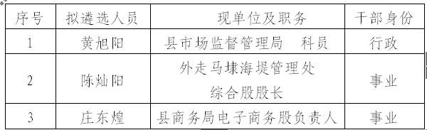 按照《惠安县纪委监察委关于公开遴选纪检监察干部的公告》要求,综合笔试、面试成绩和考察情况,经县纪委常委会研究,确定黄旭阳等3名同志为惠安县纪委监察委拟遴选人员,现予以公示。公示时间:2018年6月14日至6月21日。公示期间欢迎来电、来信、来访反映情况。