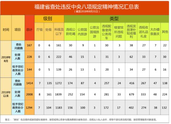2018年8月,福建查处违反中央八项规定精神问题167件,处理228人,给予党纪政务处分144人。截至8月31日,福建查处违反中央八项规定精神情况如下: