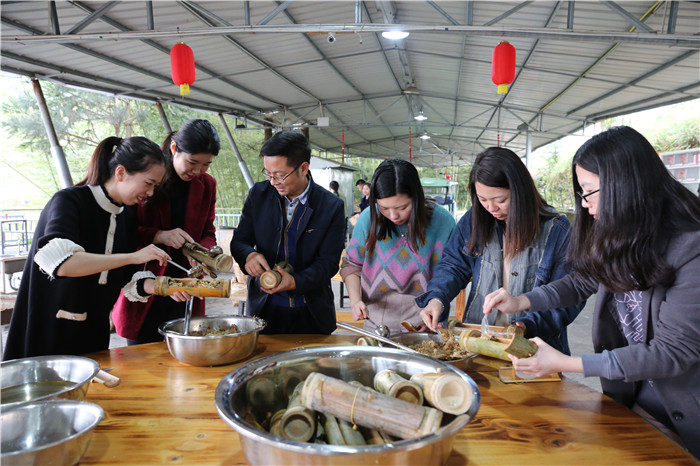 培训课余,安排学员动手制作晚餐。大锅饭、竹筒饭,大家一起生火、洗菜、切菜、煮饭,体验生活,提升团队意识。(陈贤昌 摄)