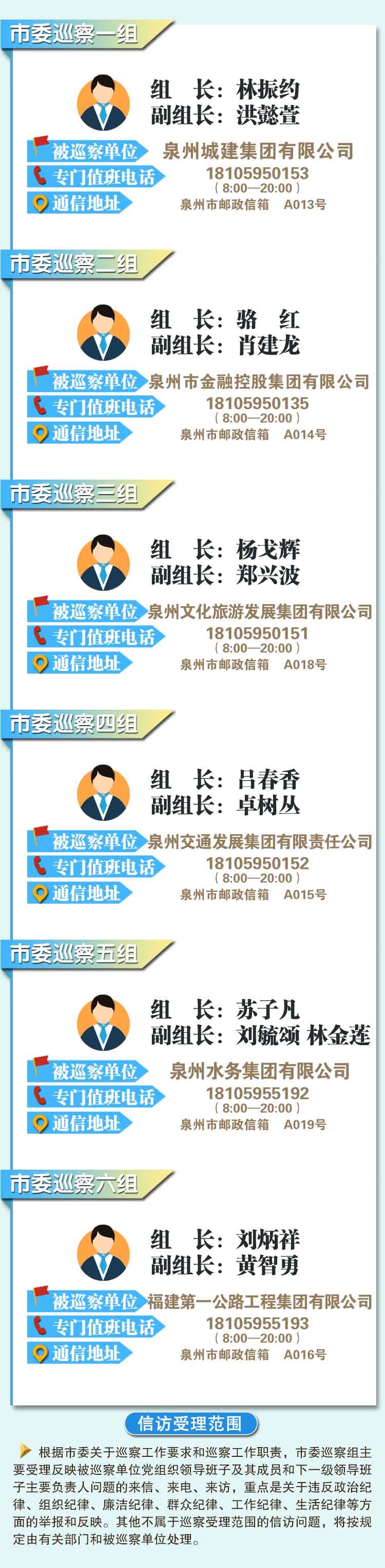 根据《中国共产党巡视工作条例》及中央、省委、市委关于巡视巡察工作的部署要求,经市委巡察工作领导小组同意,从2019年4月中旬开始,开展十二届市委第七轮第二批巡察,被巡察单位为泉州城建集团有限公司、泉州市金融控股集团有限公司、泉州文化旅游发展集团有限公司、泉州交通发展集团有限责任公司、泉州水务集团有限公司、福建第一公路工程集团有限公司,巡察时间一个月左右。日前,6个巡察组已进驻被巡察单位。