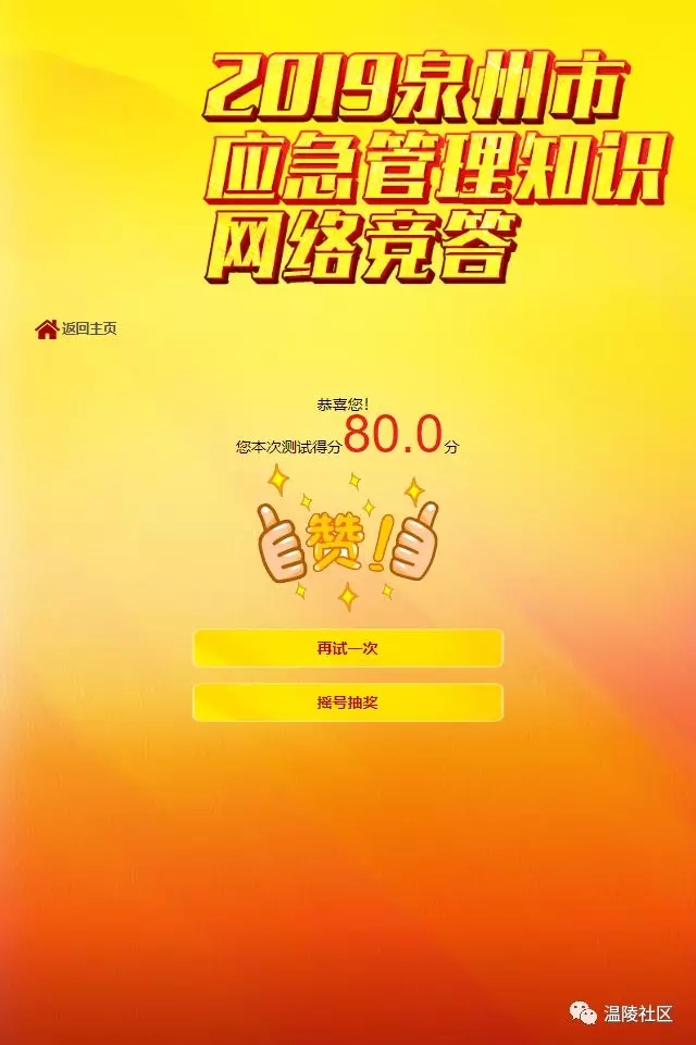 3、提交后自动显示成绩,若<80分,还有两次机会进行挑战。若≥80分,即可进入抽奖页面,抽奖完同样还有两次答题机会。