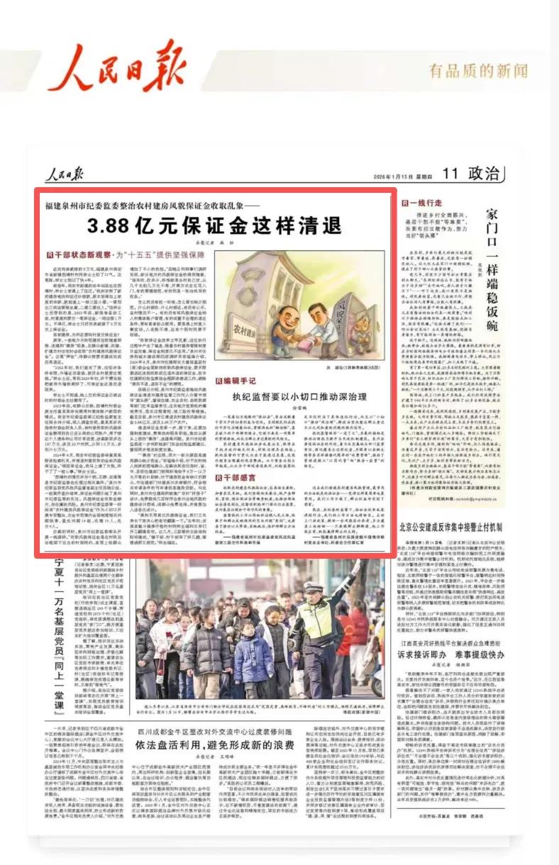 1月15日《人民日报》政治版头条刊发泉州市纪委监委整治农村建房风貌保证金收取乱象的经验做法