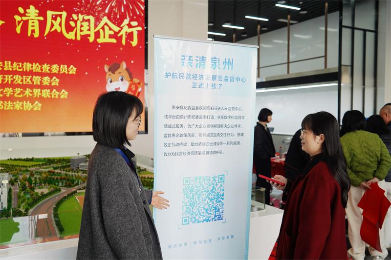 “企业生产经营情况如何?有何意见建议?”纪检监察干部一边为企业职工送上新春祝福,一边主动问询企业发展需求,同步宣传推广“亲清泉州”护航民营经济发展云监督中心,现场指导企业扫码了解、便捷反馈问题诉求,精准收集营商环境意见建议,助力营商环境持续优化提升。